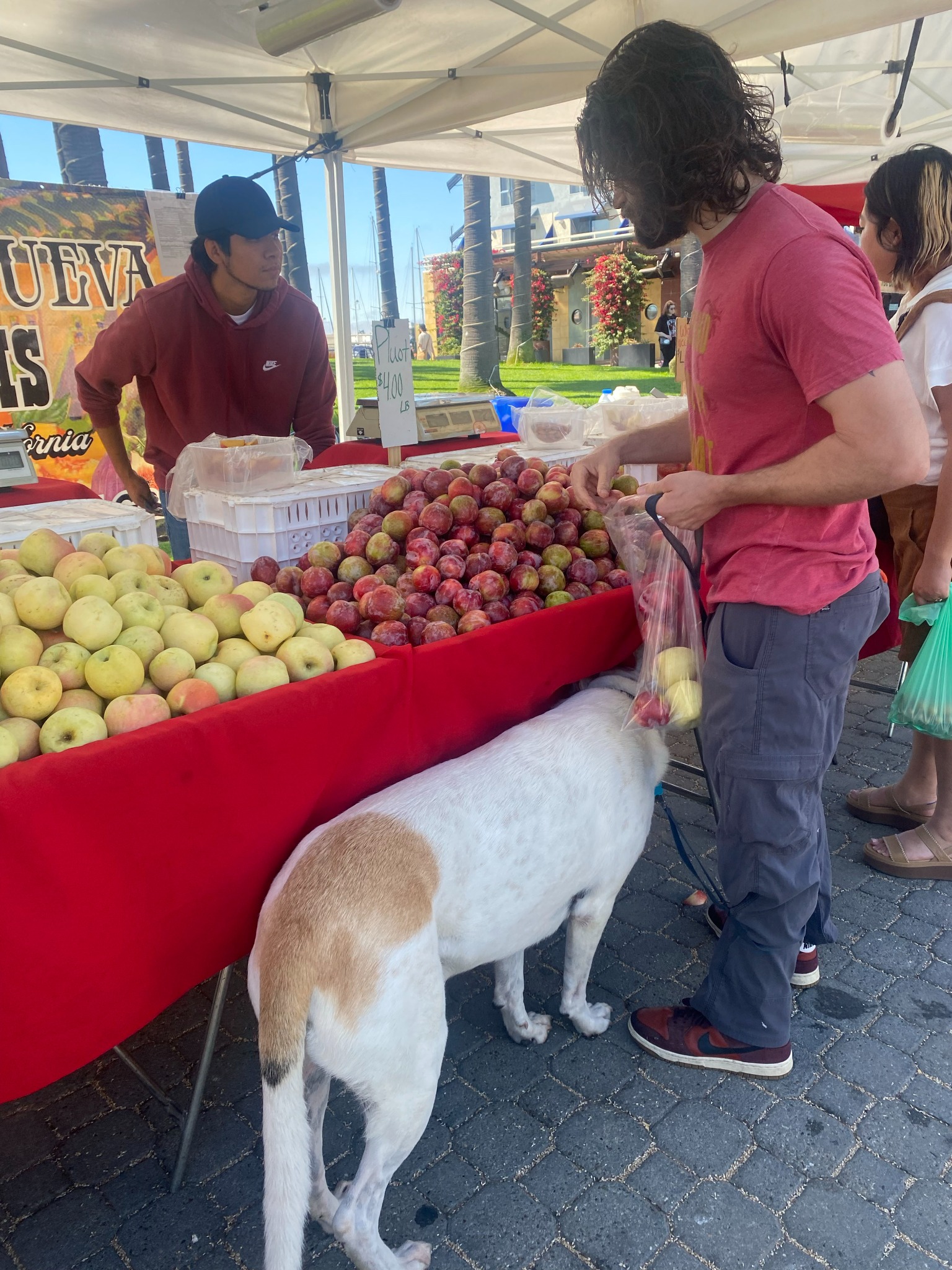 A shopper visits the Villanueva Farms stand with his dog and buys fruits on Sunday, Sept. 21, 2025. (Angella Dorado)