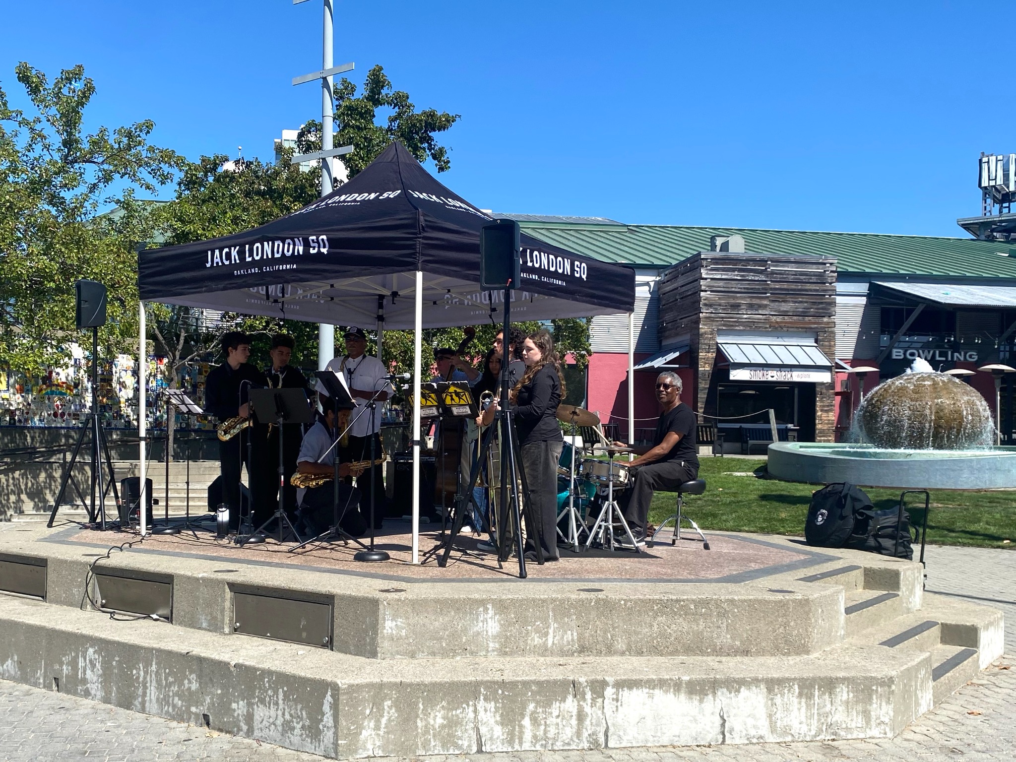 A band performs live at Jack London Square, providing visitors at the farmers market with live music on Sunday, Sept. 21, 2025. (Angella Dorado)