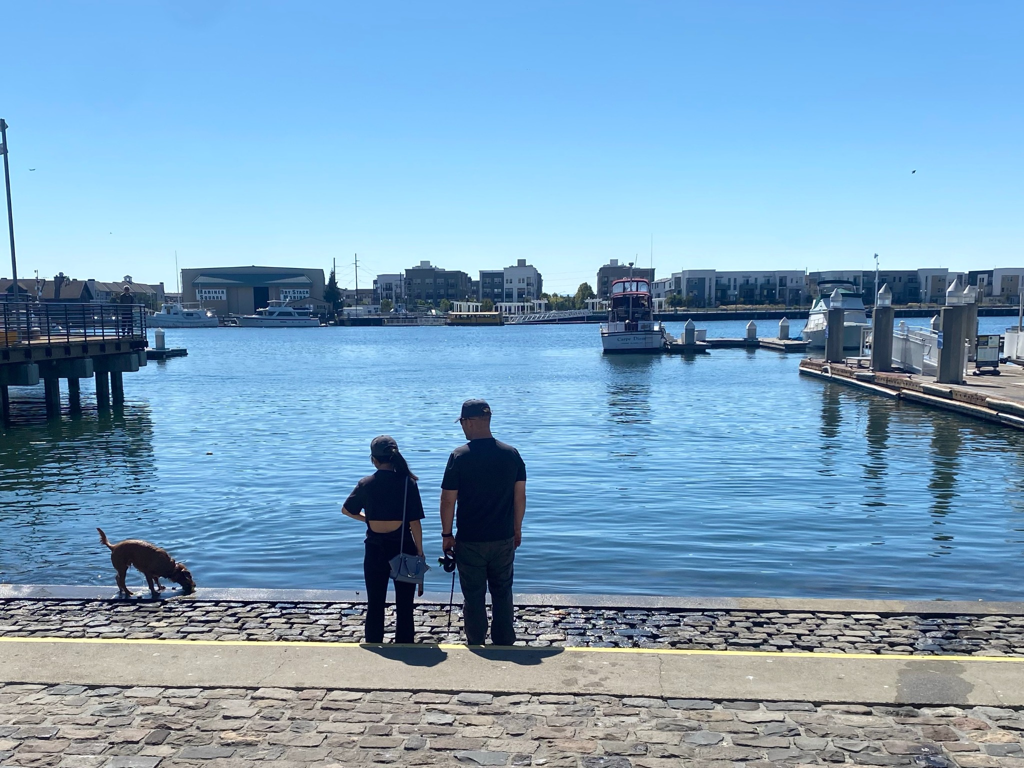 Visitors play fetch with their dog in front of the water at Jack London Square on Sunday, Sept. 21, 2025. (Angella Dorado)